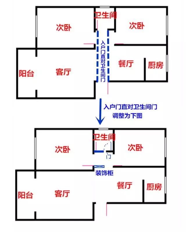 這不,很多業主就是這樣,好不容易買到朝南的戶型,卻發現入戶門直對衛生間門,這也讓人太不舒服了,對吧?